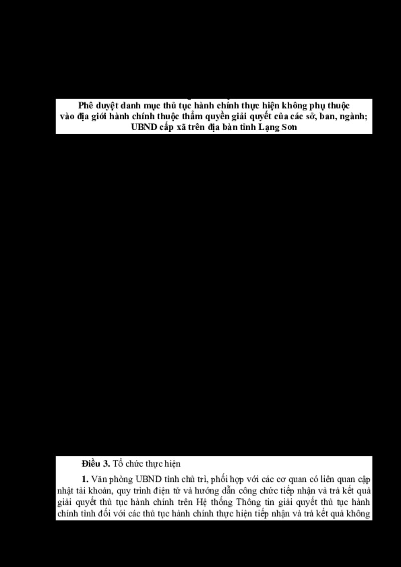 | Tiêu đề văn bản | QUYẾT ĐỊNH Phê duyệt danh mục thủ tục hành chính thực hiện không phụ thuộc vào địa giới hành chính thuộc thẩm quyền giải quyết của các sở, ban, ngành; UBND cấp xã trên địa bàn tỉnh Lạng Sơn | ||