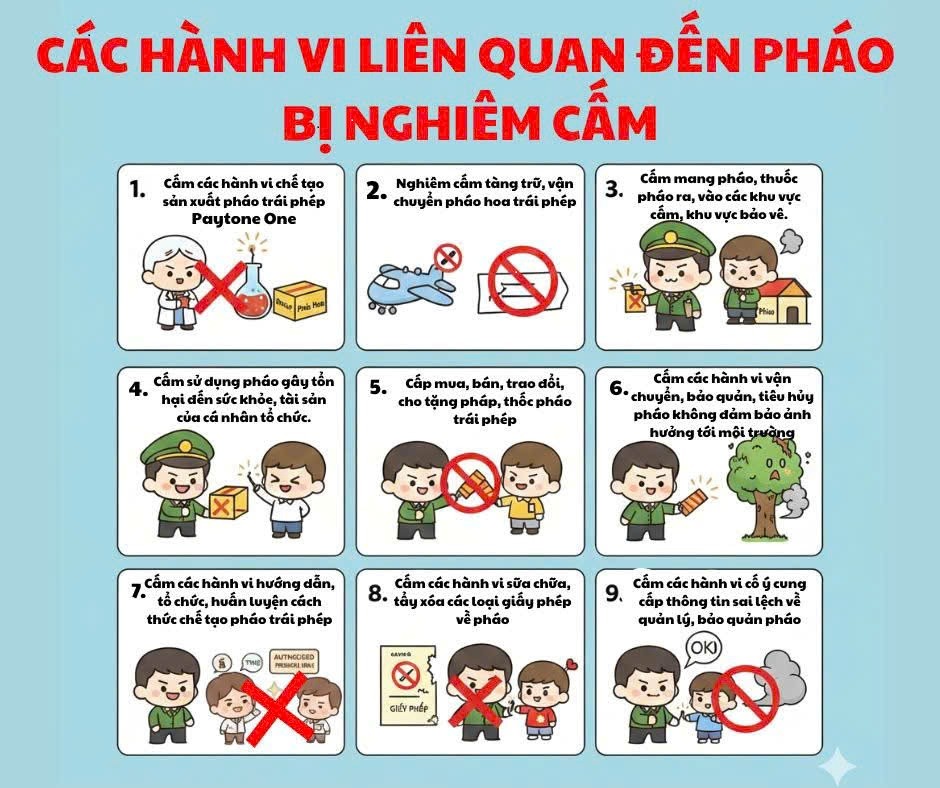 Tuyệt đối không sản xuất, mua bán, tàng trữ, vận chuyển, sử dụng trái phép các loại pháo nổ dưới mọi hình thức, đặc biệt trong đêm giao thừa và các ngày trước, trong, sau Tết nguyên đán Bính Ngọ 2026