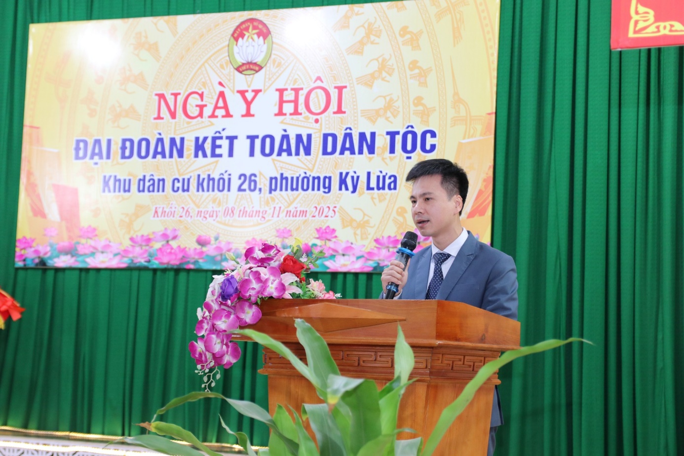 Phát biểu tại ngày hội, đồng chí Hà Minh Anh, Tỉnh ủy viên, Bí thư Đảng ủy, Chủ tịch HĐND phường chúc mừng, biểu dương những kết quả nổi bật Khối 26 đã đạt được trong năm qua. Đồng chí đề nghị thời gian tới, Khối 26 tiếp tục: Giữ vững và phát huy truyền thống đoàn kết; Đẩy mạnh phong trào thi đua yêu nước; Tích cực lao động sản xuất, phát triển kinh tế; Nâng cao chất lượng phong trào Gia đình văn hóa, xây dựng đô thị văn minh; Duy trì an ninh trật tự; Tham gia tích cực vào cuộc bầu cử Đại biểu Quốc hội và HĐND các cấp nhiệm kỳ 2026–2031.