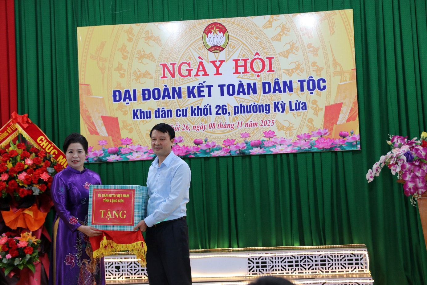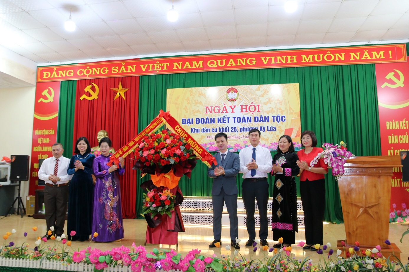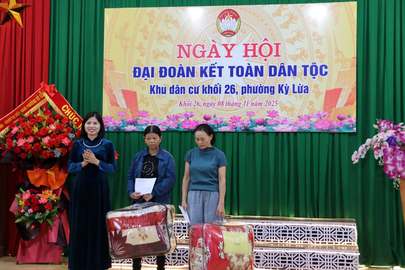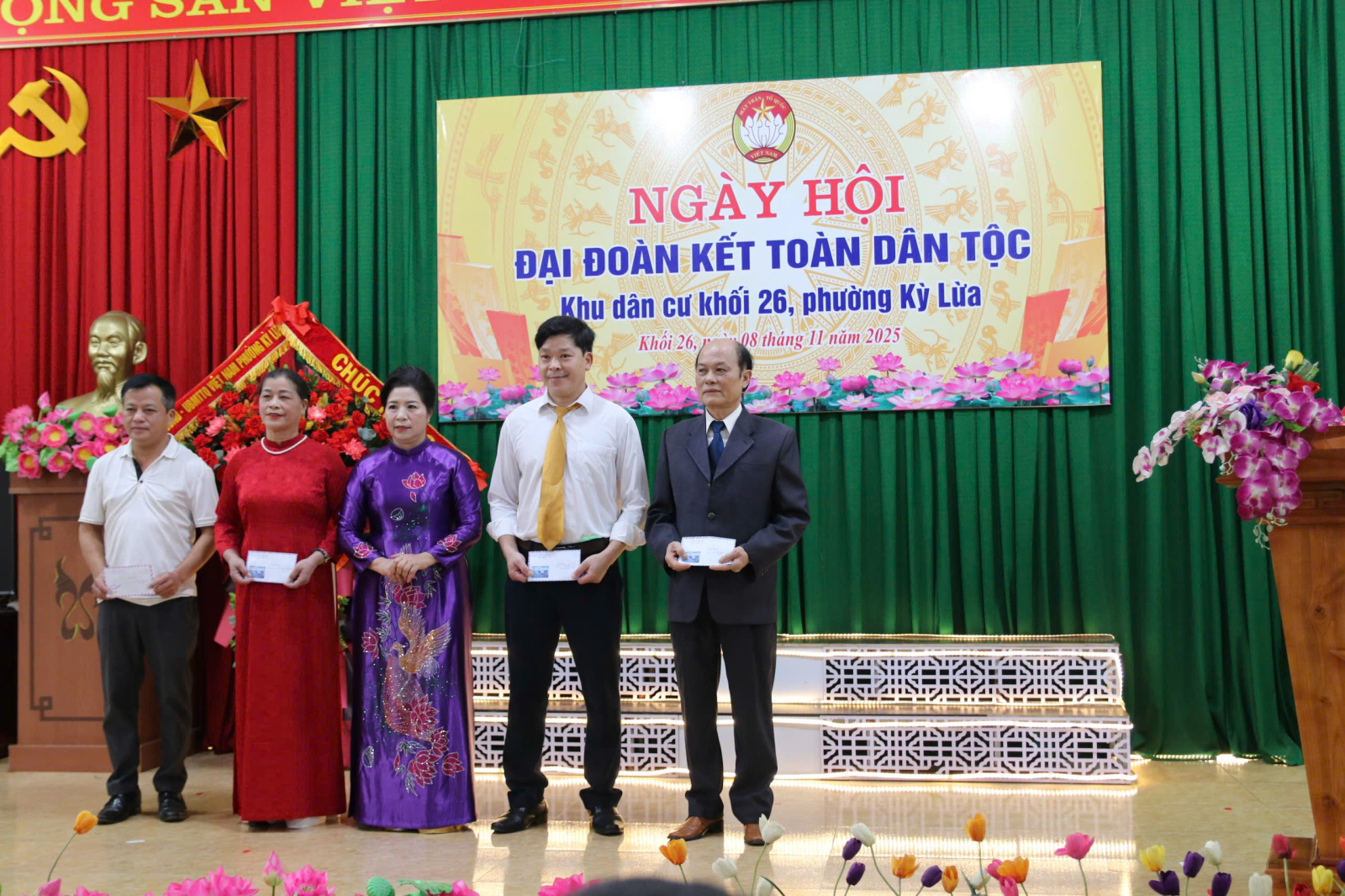 Nhân dịp này, đồng chí Hoàng Anh Tuấn, Phó Chủ tịch Ủy ban MTTQ Việt Nam tỉnh đã tặng quà chúc mừng khu dân cư Khối 26. Lãnh đạo Đảng ủy phường Kỳ Lừa cũng tặng hoa và quà chúc mừng, biểu dương các gia đình văn hóa tiêu biểu; đồng thời trao quà hỗ trợ các hộ cận nghèo và hộ có hoàn cảnh khó khăn đột xuất.