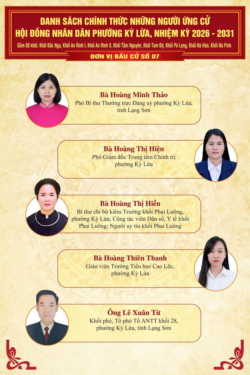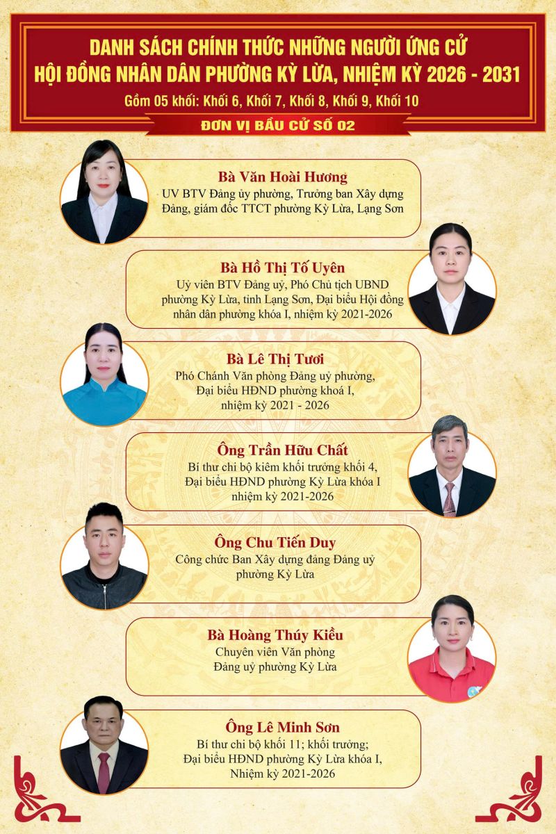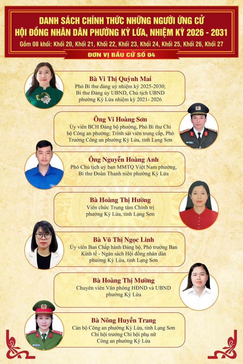 TRÊN ĐÂY LÀ DANH SÁCH CHÍNH THỨC NHỮNG NGƯỜI ỨNG CỬ ĐẠI BIỂU HĐND PHƯỜNG KỲ LỪA, NHIỆM KỲ 2026 - 2031, TẠI 07 ĐƠN VỊ BẦU CỬ TRÊN ĐỊA BÀN PHƯỜNG KỲ LỪA