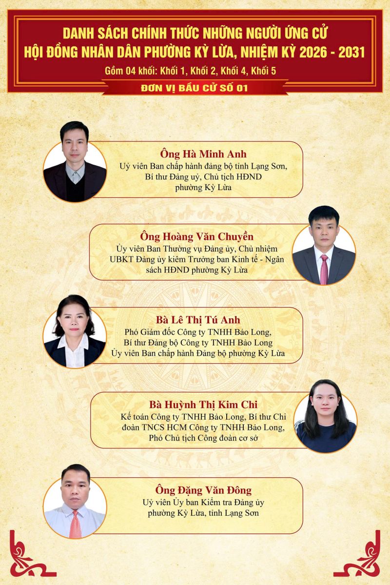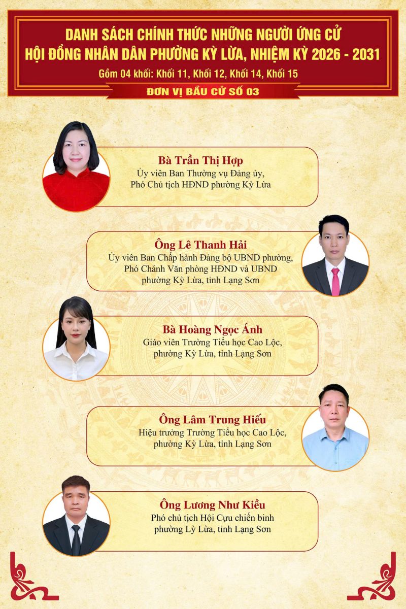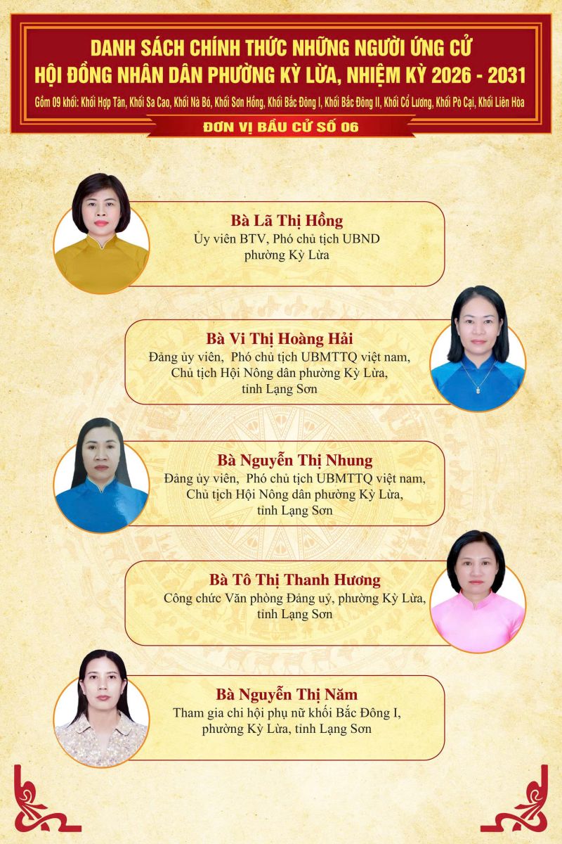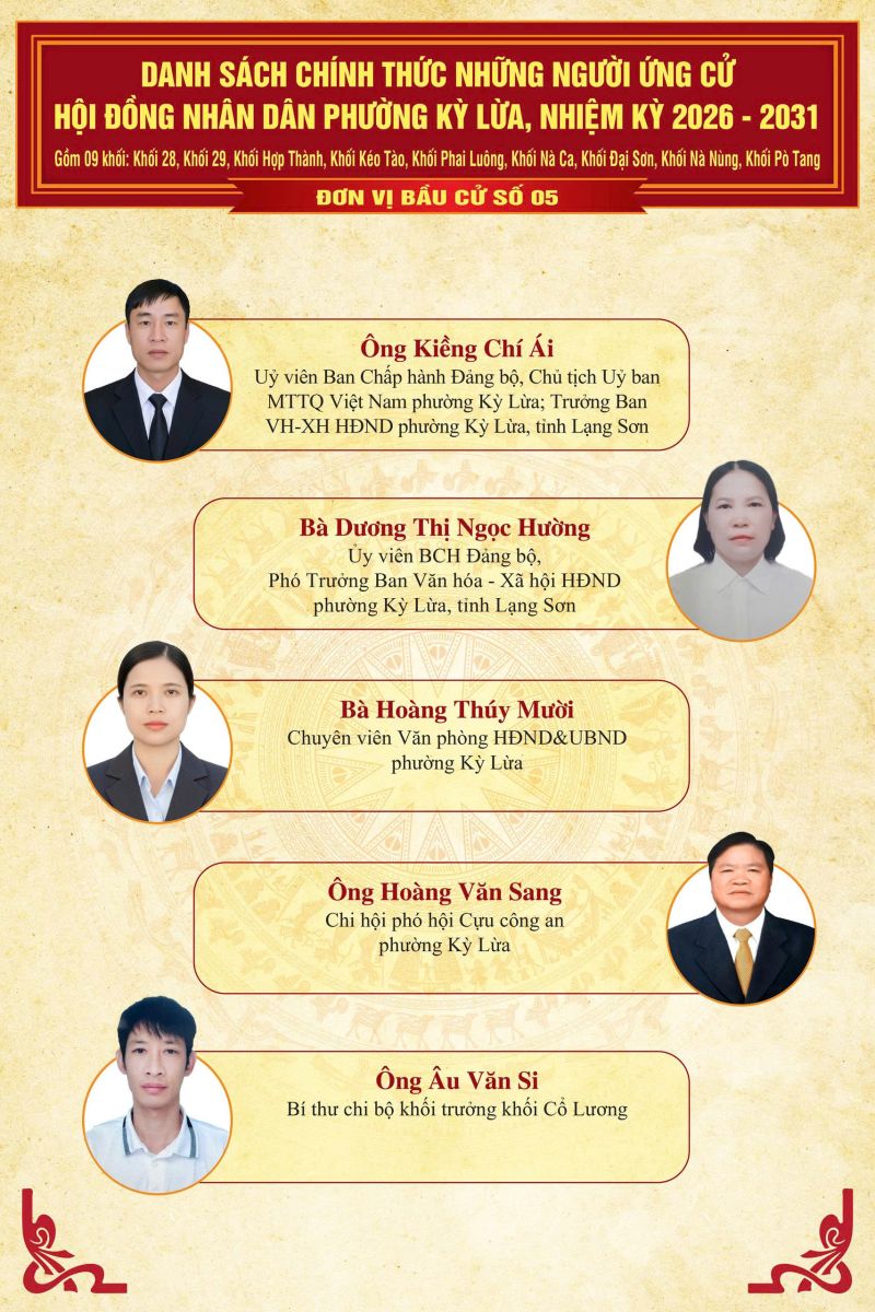 TRÊN ĐÂY LÀ DANH SÁCH CHÍNH THỨC NHỮNG NGƯỜI ỨNG CỬ ĐẠI BIỂU HĐND PHƯỜNG KỲ LỪA, NHIỆM KỲ 2026 - 2031, TẠI 07 ĐƠN VỊ BẦU CỬ TRÊN ĐỊA BÀN PHƯỜNG KỲ LỪA