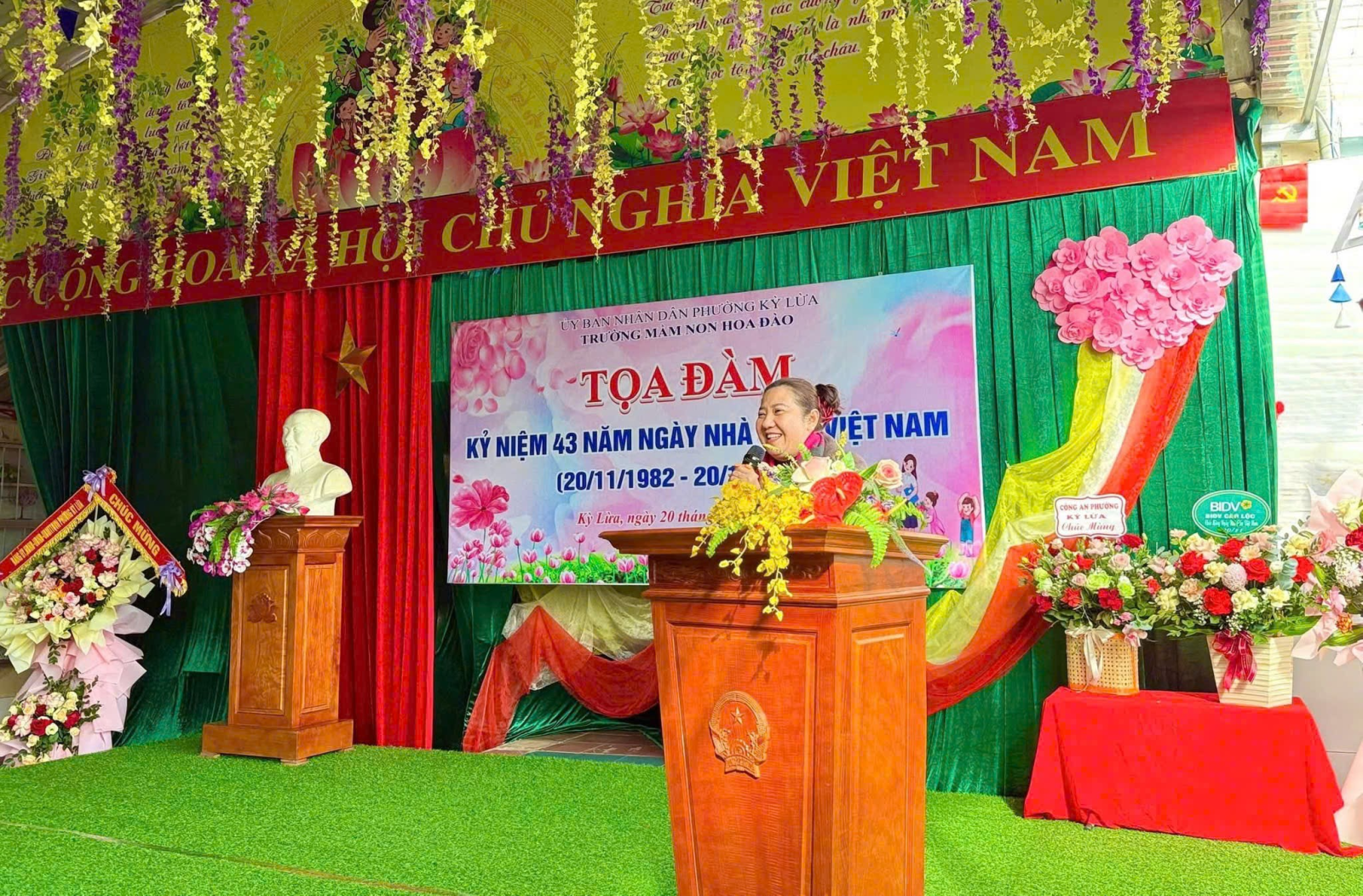 ĐỒNG CHÍ VI THỊ QUỲNH MAI, PHÓ BÍ THƯ ĐẢNG ỦY, CHỦ TỊCH ỦY BAN NHÂN DÂN PHƯỜNG KỲ LỪA DỰ LỄ KỶ NIỆM 43 NĂM NGÀY NHÀ GIÁO VIỆT NAM TẠI CÁC TRƯỜNG TRÊN ĐỊA BÀN