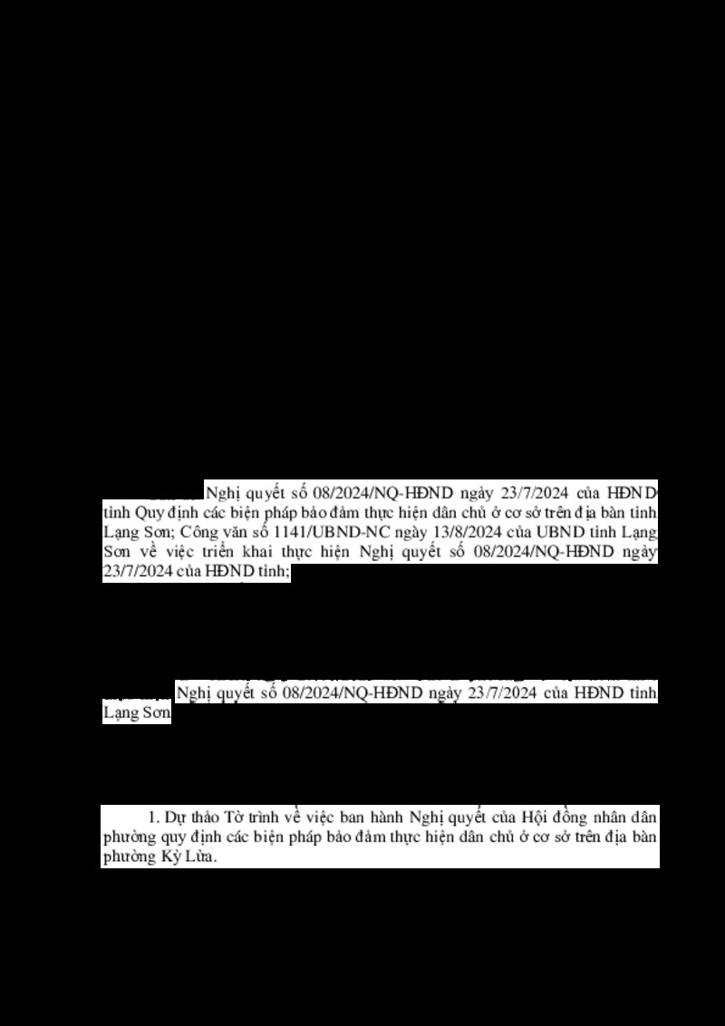 | Tiêu đề văn bản | V/v đóng góp ý kiến với dự thảo Tờ trình của UBND, Nghị quyết của HĐND quy định các biện pháp bảo đảm thực hiện dân chủ ở cơ sở trên địa bàn phường Kỳ Lừa | ||