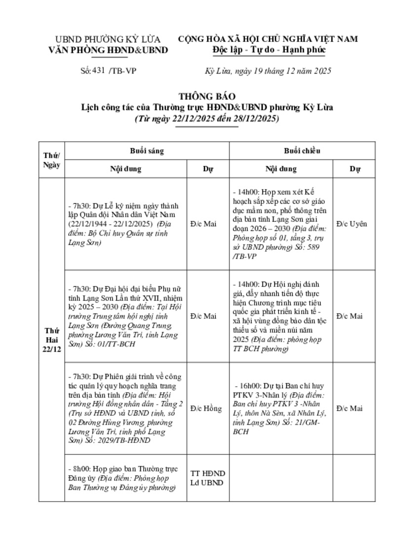 | Tiêu đề văn bản | THÔNG BÁO Lịch công tác của Thương trực HĐND&UBND phương Kỳ Lừa (Từ ngày 22/12/2025 đên 28/12/2025) | ||