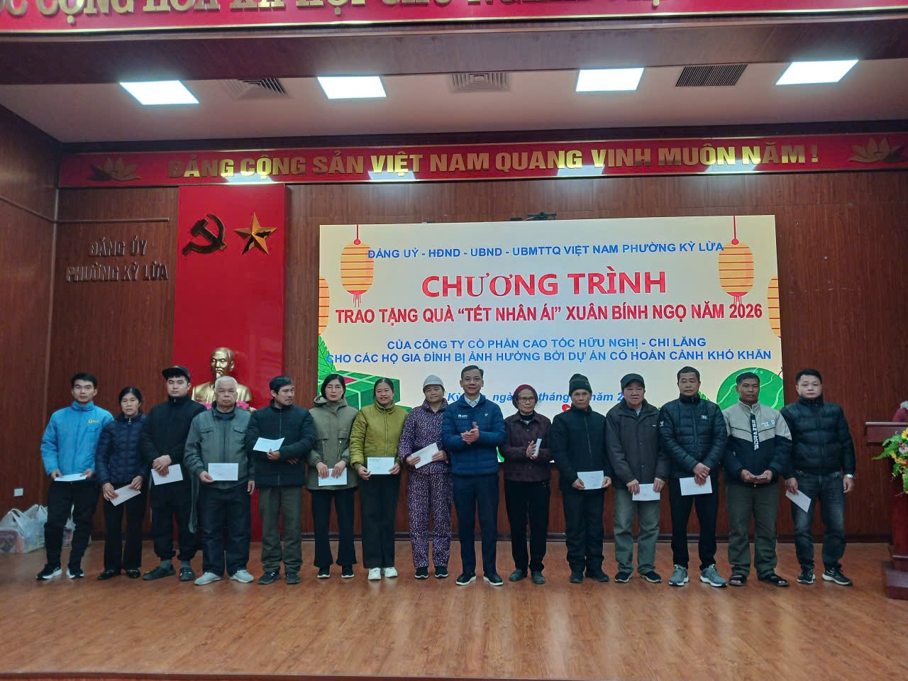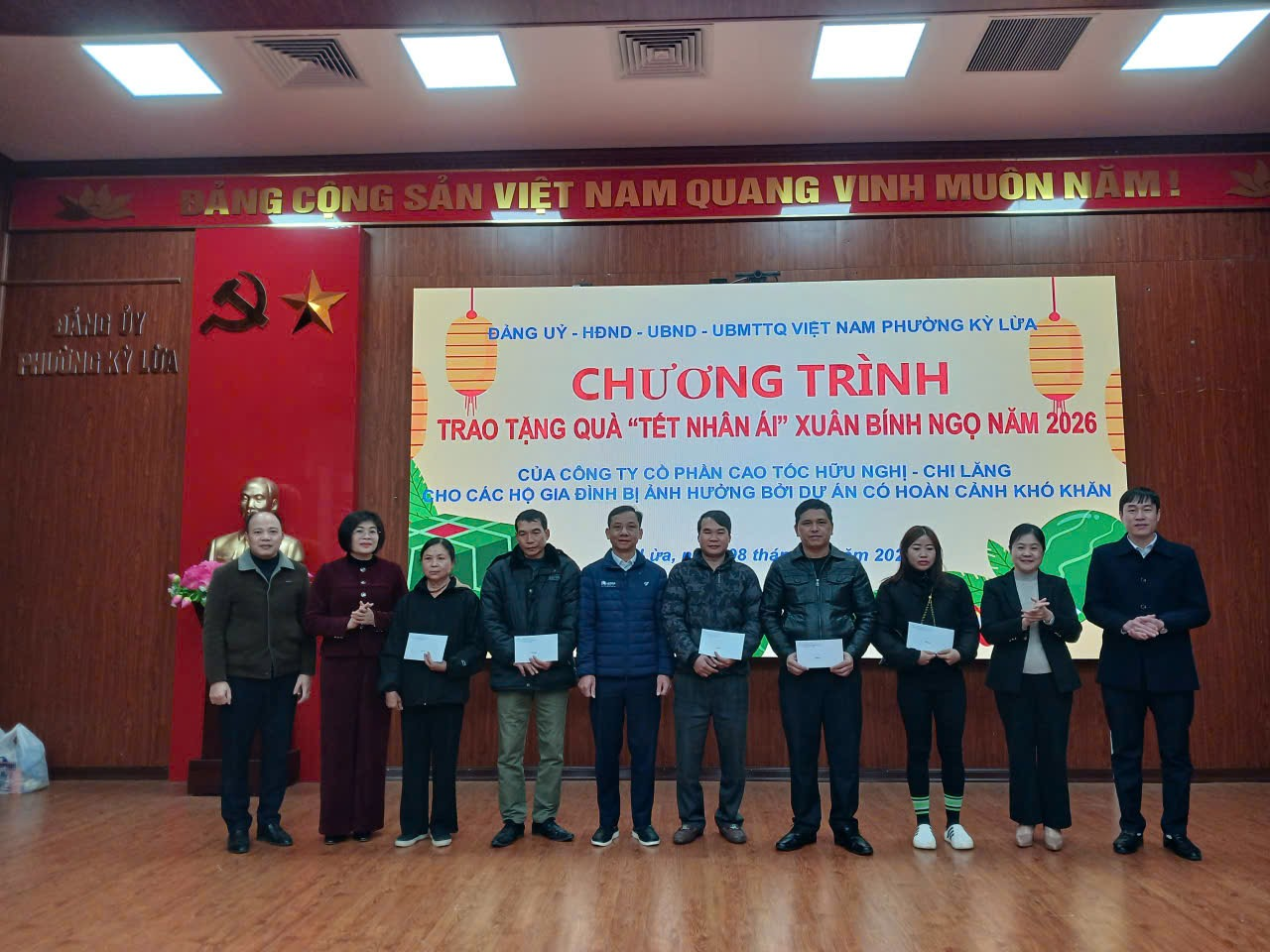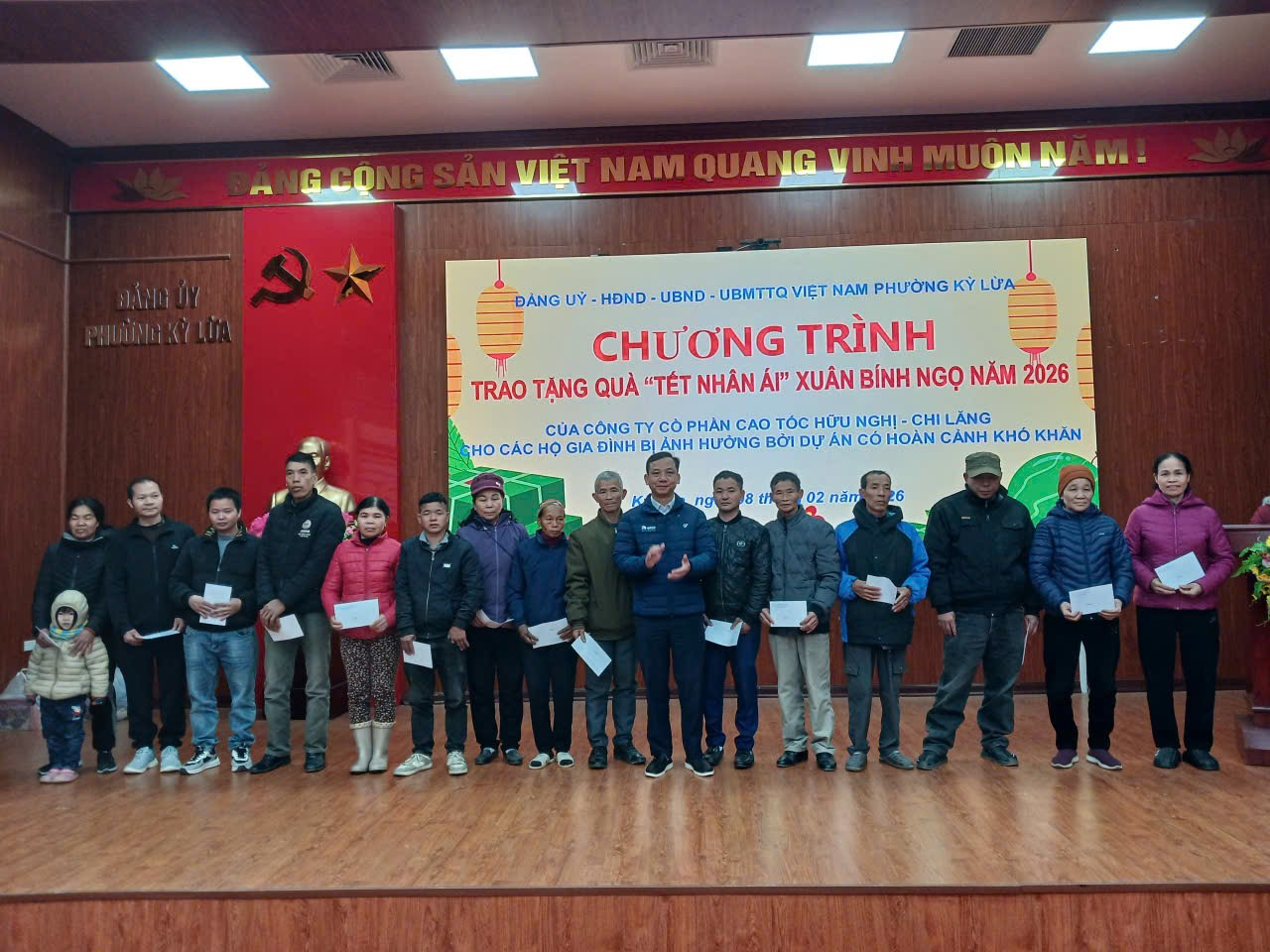 Sáng ngày 08/02/2026 UBND phường phối hợp với Công ty Cổ phần Cao tốc Hữu Nghị - Chi Lăng tổ chức tặng quà nhân ái Xuân Bính Ngọ năm 2026 cho các hộ dân bị ảnh hưởng bởi dự án Cao tốc Hữu Nghị - Chi Lăng có hoàn cảnh khó khăn trên địa bàn phường. Tham dự chương trình có Ông Nguyễn Công Hạ, Phó Giám đốc ban quản lý Công ty Cổ phần Cao tốc Hữu Nghị - Chi Lăng; đại diện lãnh đạo UBND phường Kỳ Lừa có đồng chí Lã Thị Hồng, Ủy viên Ban thường vụ Đảng ủy, Phó chủ tịch UBND phường; đồng chí Hồ Thị Tố Uyên, Ủy viên Ban thường vụ Đảng ủy, Phó chủ tịch UBND phường; Lãnh đạo Ủy ban MTTQ, các phòng, ban của phường, cùng với 72 hộ dân tham dự chương trình.