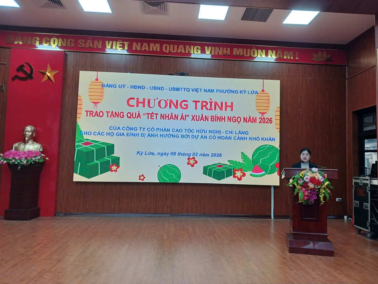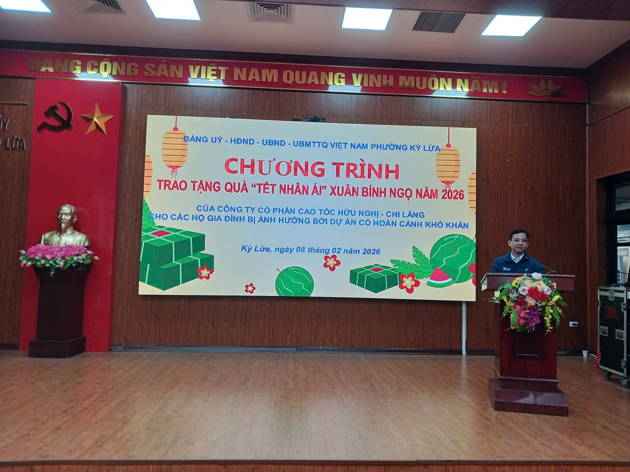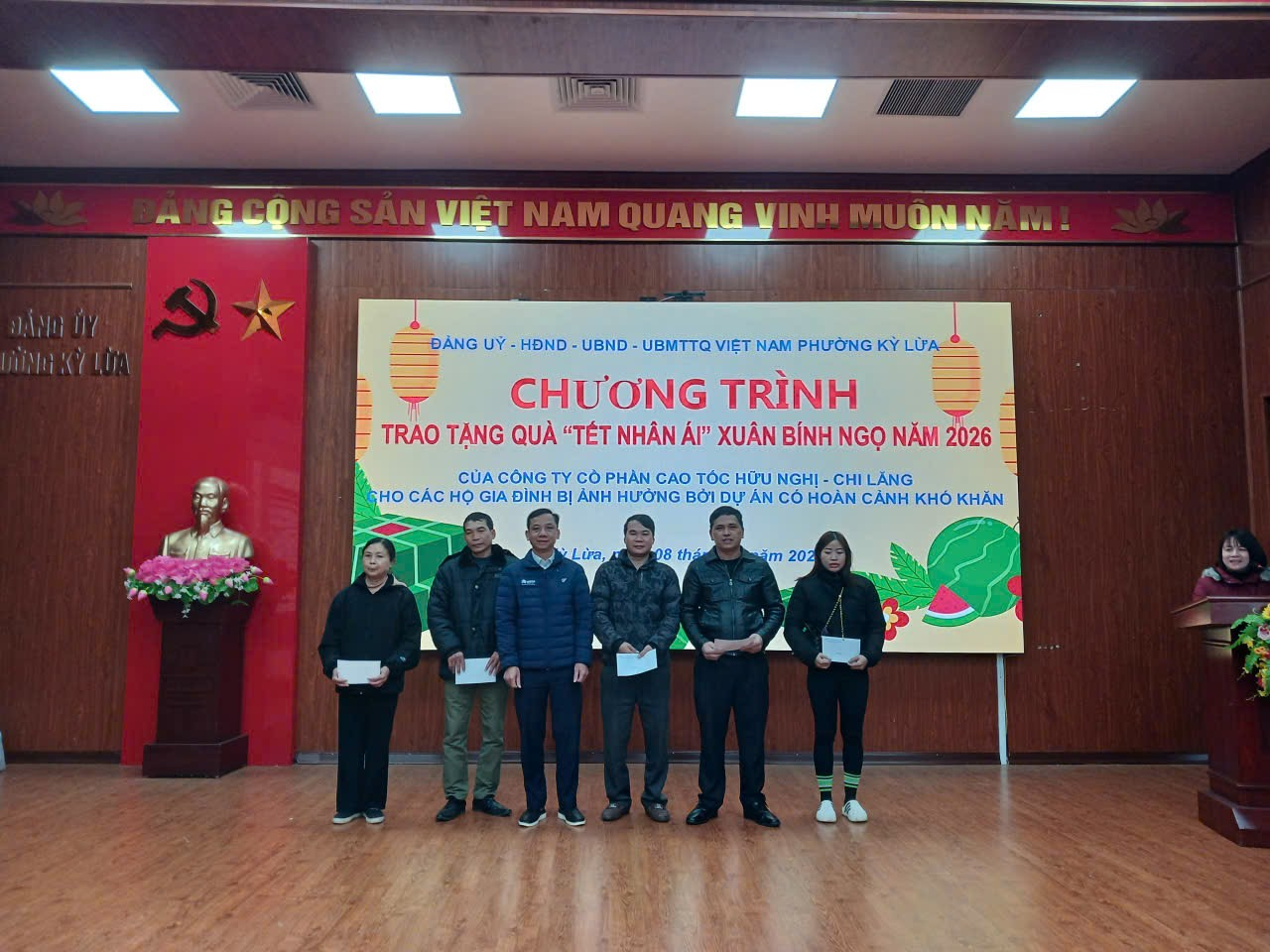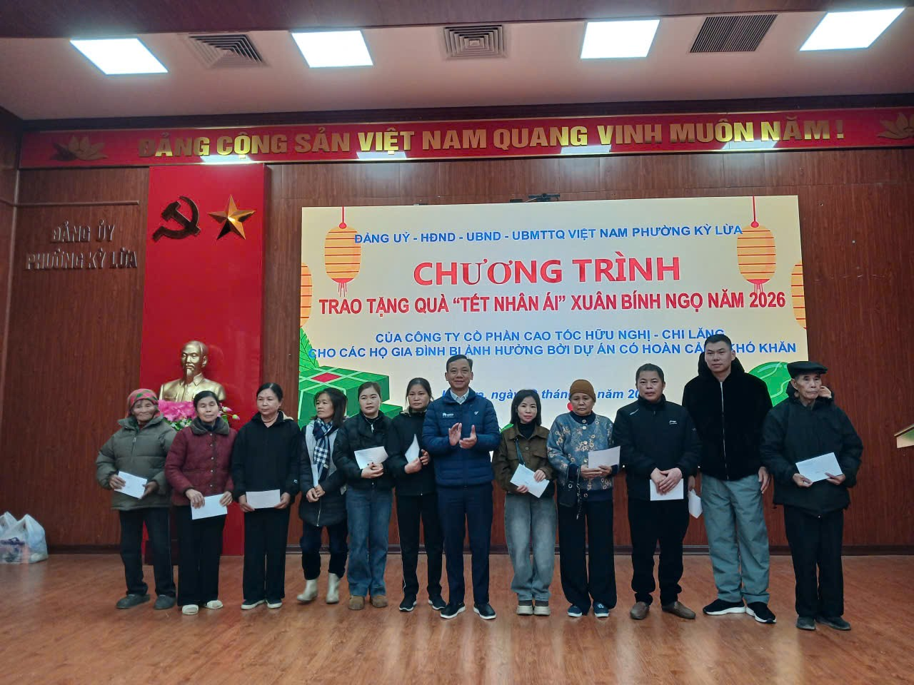 Sáng ngày 08/02/2026 UBND phường phối hợp với Công ty Cổ phần Cao tốc Hữu Nghị - Chi Lăng tổ chức tặng quà nhân ái Xuân Bính Ngọ năm 2026 cho các hộ dân bị ảnh hưởng bởi dự án Cao tốc Hữu Nghị - Chi Lăng có hoàn cảnh khó khăn trên địa bàn phường. Tham dự chương trình có Ông Nguyễn Công Hạ, Phó Giám đốc ban quản lý Công ty Cổ phần Cao tốc Hữu Nghị - Chi Lăng; đại diện lãnh đạo UBND phường Kỳ Lừa có đồng chí Lã Thị Hồng, Ủy viên Ban thường vụ Đảng ủy, Phó chủ tịch UBND phường; đồng chí Hồ Thị Tố Uyên, Ủy viên Ban thường vụ Đảng ủy, Phó chủ tịch UBND phường; Lãnh đạo Ủy ban MTTQ, các phòng, ban của phường, cùng với 72 hộ dân tham dự chương trình.