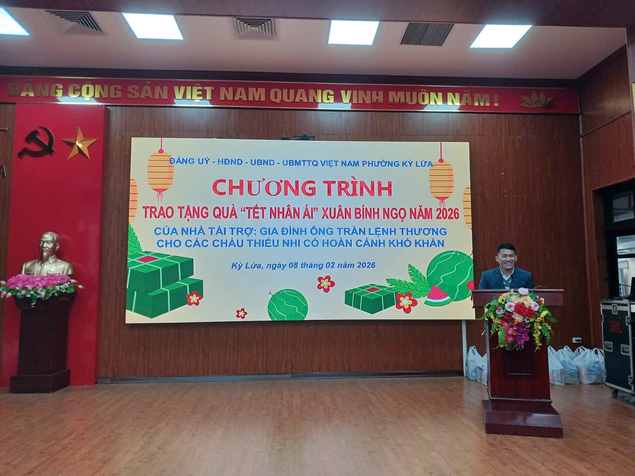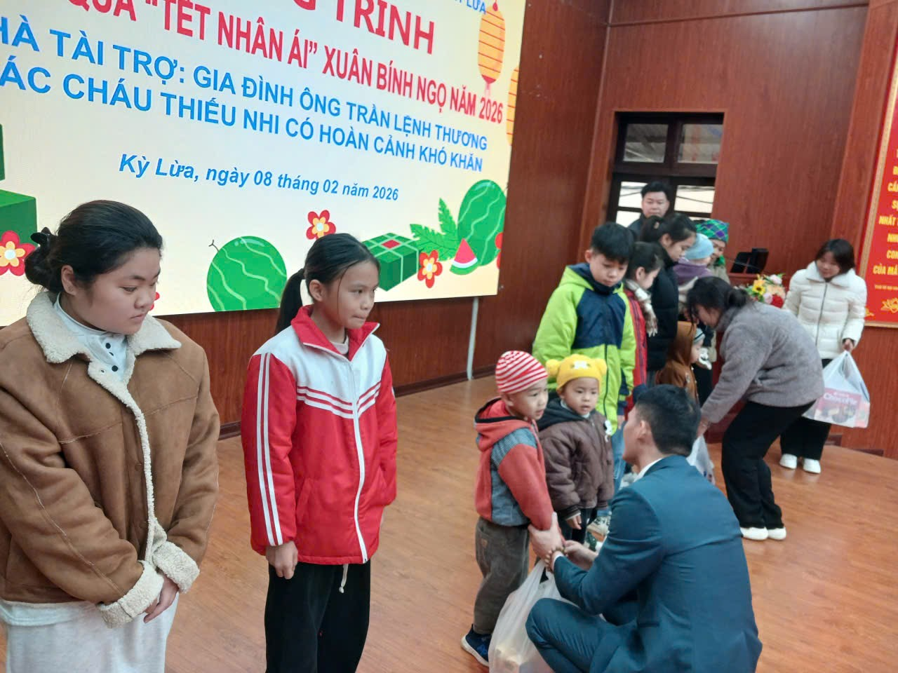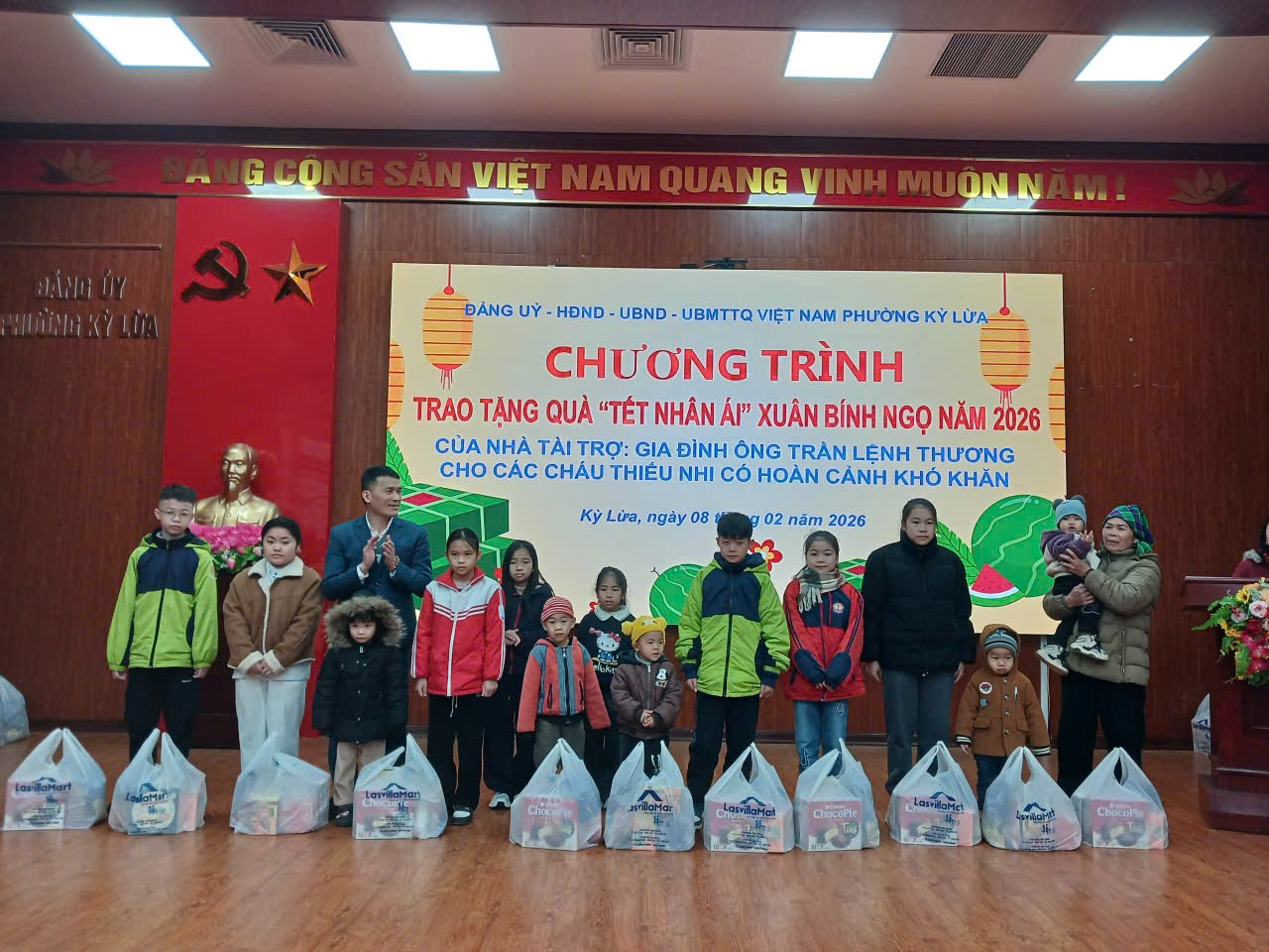 Sáng ngày 08/02/2026 UBND phường phối hợp với Gia đình ông Trần Lệnh Thương, nhà tài trợ tặng quà nhân ái Xuân Bính Ngọ năm 2026 cho các cháu thiếu nhi thuộc hộ nghèo, cận nghèo, gia đình hoàn cảnh khó khăn trên địa bàn phường. Tham dự chương trình có ông Trần Lệ Thương, nhà tài trợ chương trình; có đại diện lãnh đạo UBND phường Kỳ Lừa chí đồng chí Hồ Thị Tố Uyên, Ủy viên Ban thường vụ Đảng ủy, Phó chủ tịch UBND phường; đồng chí Lã Thị Hồng, Ủy viên Ban thường vụ Đảng ủy, Phó chủ tịch UBND phường; Lãnh đạo Ủy ban MTTQ, các phòng, ban của phường, cùng với 39 cháu thiếu nhi tham dự chương trình.