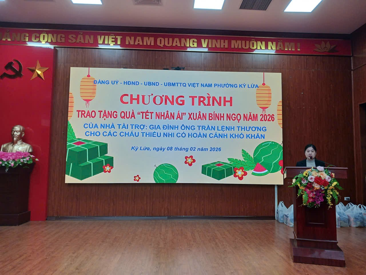 Đồng chí Hồ Thị Tố Uyên, Ủy viên Ban thường vụ Đảng ủy, Phó chủ tịch UBND phường phát biểu được sự quan tâm gia đình của ông Trần Lệnh Thương, là một nhà tài trợ những món quá thật quý giá là niềm vinh dự tự hào của cấp ủy, chính quyền và nhân dân phường Kỳ Lừa với tấm lòng “tương thân tương ái” “lá lành đùm lá rách” trong dịp Tết Nhân ái Bính Ngọ năm 2026 là một niềm vui phấn khởi là hoạt động mang ý nghĩa nhân văn sâu sắc, thể hiện truyền thống đoàn kết, nghĩa tình của dân tộc Việt Nam.