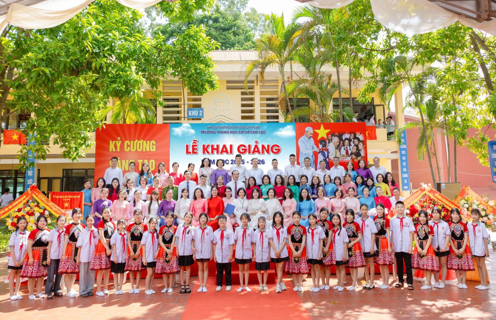 Sau nghi thức chào cờ trang nghiêm, thầy và trò các trường đã nghe bài phát biểu của đồng chí Tổng Bí thư Tô Lâm trong Lễ khai giảng trực tuyến toàn quốc, cùng tiếng trống khai trường ngân vang tại các điểm cầu trên cả nước. Tại buổi lễ, lãnh đạo Ban Giám hiệu các trường đã đọc Thư của Chủ tịch nước gửi ngành Giáo dục nhân dịp khai giảng năm học mới. Trong diễn văn khai giảng, Ban Giám hiệu các trường nhấn mạnh những kết quả nổi bật đã đạt được trong năm học 2024 – 2025, đồng thời khích lệ tinh thần đổi mới, sáng tạo, quyết tâm hoàn thành tốt nhiệm vụ năm học 2025 – 2026 với chủ đề: “Tiếp tục đổi mới – Vững bước tương lai – Tất cả vì học sinh thân yêu”.
