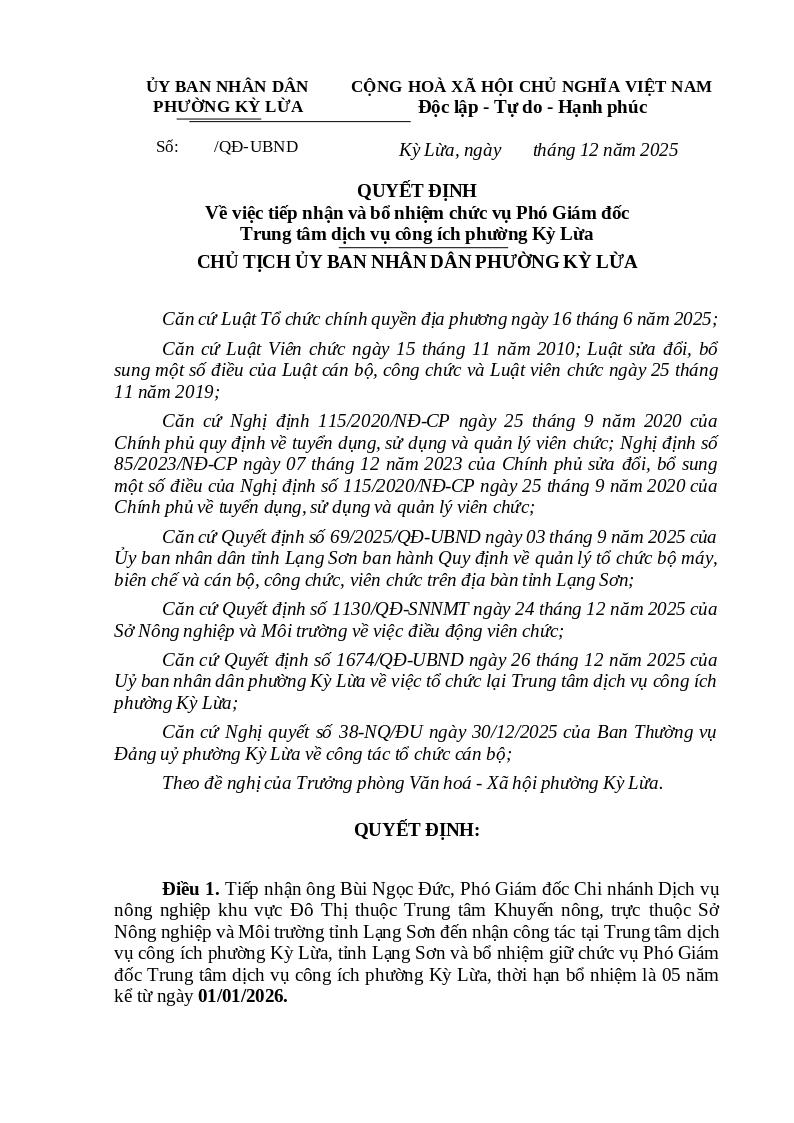 | Tiêu đề văn bản | QUYẾT ĐỊNH Về việc tiếp nhận và bổ nhiệm chức vụ Phó Giám đốc Trung tâm dịch vụ công ích phường Kỳ Lừa | ||